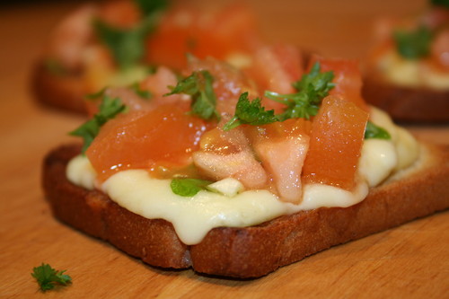 На теплые ломтики хлеба выложить помидорную массу. Брускетта готова!