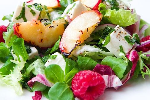 Разогрейте до 200°С духовку и на горячий противень положите абрикосы, смоченные лимонным соком. Пеките около 2-3 минут, переворачивая. Приготовьте медовый соус винегрет, согласно рекомендации, не добавляя чеснок. Смешайте его с мелко порезанной мятой. Лук присыпьте солью, чтобы стал мягким. Положите в миску рваные листья салата, аккуратно посыпьте солью, добавьте уже мягкий лук, Фету и абрикосы. Полейте соусом, посыпьте свежо смолотым черным перцем и украсьте малинами, если вы их использовали.